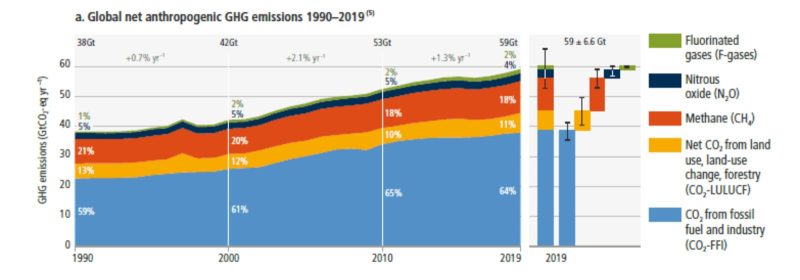 De acordo com o gráfico apresentado a seguir, os combustíveis fósseis e a indústria continuam a ser os únicos responsáveis por cerca de 64% do total das emissões antropogénicas de gases com efeito de estufa (GEE) para a atmosfera [5